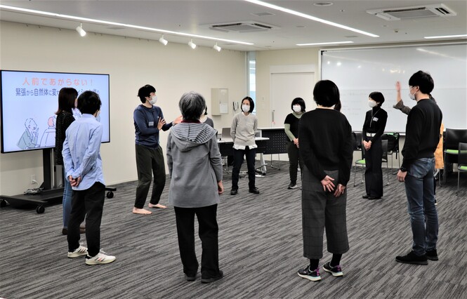 大切なのは緊張を味方にすること。そのための考え方を学び、シアターゲームを通じて自分をコントロールする力を身につける講座を開催しました。