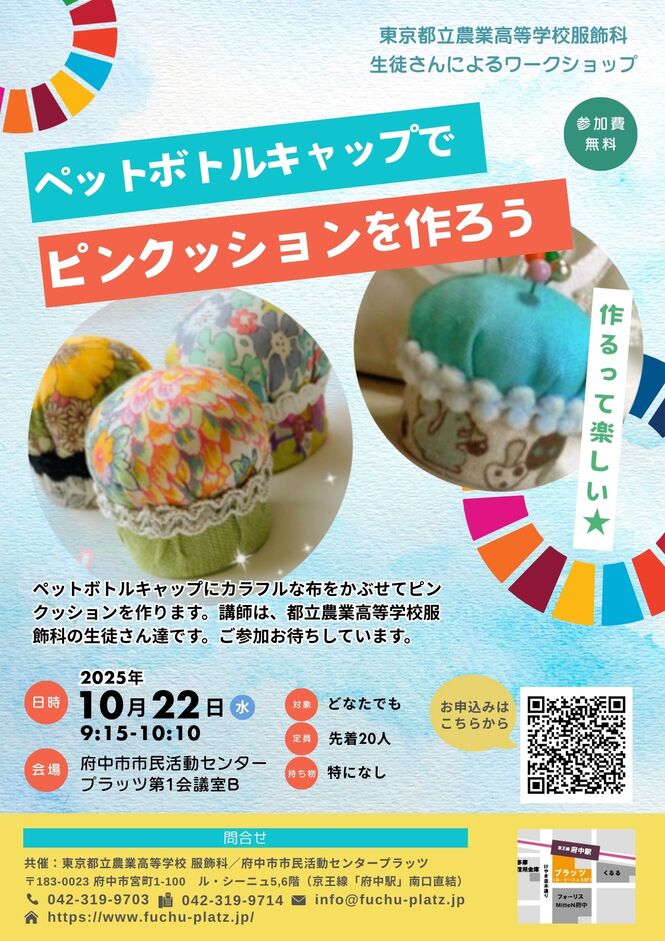 東京都立農業高等学校服飾科とプラッツの共催事業として、ペットボトルキャップを使ったピンクッション作りを10月22日に開催しました。